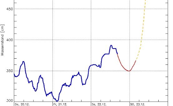 Auch wenn die Situation fatal und fast auf den Tag genau an das "Jahrhunderthochwasser" kurz vor Weihnachten 1993 erinnert (siehe Video), dürfte der Höchststand diesmal deutlich niedriger ausfallen als vor 19 Jahren.