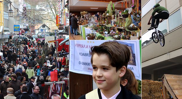 Gut besucht war die Bahnhofstraße beim verkaufsoffenen Sonntag (l.). Mitte oben der Ostermarkt in der Stadthalle, unten Louis Walter, der als "Bärlauch-Hoheit 2013" gekürt wurde. Rechts die Bike-Vorführung der Gruppe "Dirtpark Schönbrunn". (Fotos: Hubert Richter)