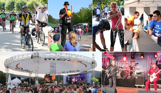 An die 2.000 Teilnehmer der Tour waren am Vormittag in Weinheim gestartet. Trotz sommerlicher Hitze mit Temperaturen von mehr als 35 Grad kamen die meisten Radler nach einer letzten gemeinsamen Pause in Mossbrunn gegen Abend wohlbehalten in Eberbach an. Mit Applaus wurden sie am Radweg im Sportgebiet in der Au empfangen. Dort warteten auf sie zunächst Erfrischungen in Form einer Wasserspritzanlage der Freiwilligen Feuerwehr und kühlenden Wasserschwämmen. Frischmachen konnten sich die Sportler auch in einem eigens zum Duschen aufgestellten "Showertruck". Zusammen mit den Tourveranstaltern des Südwestrundfunks und der EnBW hatten die Eberbacher unter Federführung des Kulturamts ein großes Fest vorbereitet. Am Nachmittag spielte die Musikkapelle "Kleiner Odenwald" aus Allemühl, und gegen Abend zog Jongleur "Jeremy" Klein und Groß in seinen Bann. Die eigentliche Etappenparty startete um 19 Uhr mit den Bands "Schlagerfeld" und der "Spider Murphy Gang" auf der großen Showbühne, vor der ein riesiger runder Pavillon aufgebaut war. Um 22 Uhr war schon wieder Schluss, nachdem die Stars aus Bayern mit Hits wie "Skandal im Sperrbezirk" für ausgelassene Stimmung gesorgt hatten. Denn die Radler brauchten ihren Schlaf für die nächsten Etappen, die an insgesamt sieben Tagen von Weinheim bis Stockach am Bodensee führen. Heute Morgen machten sich die Radler nach dem Frühstück auf in Richtung Bad Mergentheim. Übernachtet hatten viele von ihnen im Matratzenlager der Hohenstaufen-Sporthalle, wo 500 Schlafplätze vorbereitet waren, oder in Zelten auf dem Rasendreieck neben dem Fußballstadion. Einige Teilnehmer waren auch in umliegenden Hotels untergebracht, wofür Shuttlebusse eingesetzt waren.