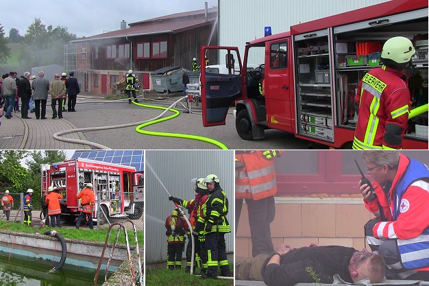 In der angenommenen Übungslage gab es bei Wartungsarbeiten an einer Gastherme in der Lagerhalle eines Gewerbebetriebs im “Kurzgewann” eine Verpuffung mit anschließendem Brand.
