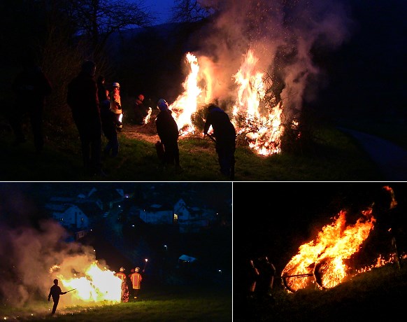 Die Freiwillige Feuerwehr und die Pleutersbacher Jugendfeuerwehr löschten diesmal nicht, sondern legten selbst Feuer. Zunächst wurde oberhalb des Dorfs der Haufen ausgedienter Weihnachtsbäume in Brand gesetzt, und kurz darauf loderten die Flammen meterhoch in den Himmel. Wenige Minuten später führten zwei Feuerwehrleute dann das brennende Doppelrad, gefüllt mit trockenem Stroh, über Wiesen und Wege hinunter zum Bolzplatz am Neckar. Zu sehen war das Schauspiel fast vom ganzen Dorf aus.